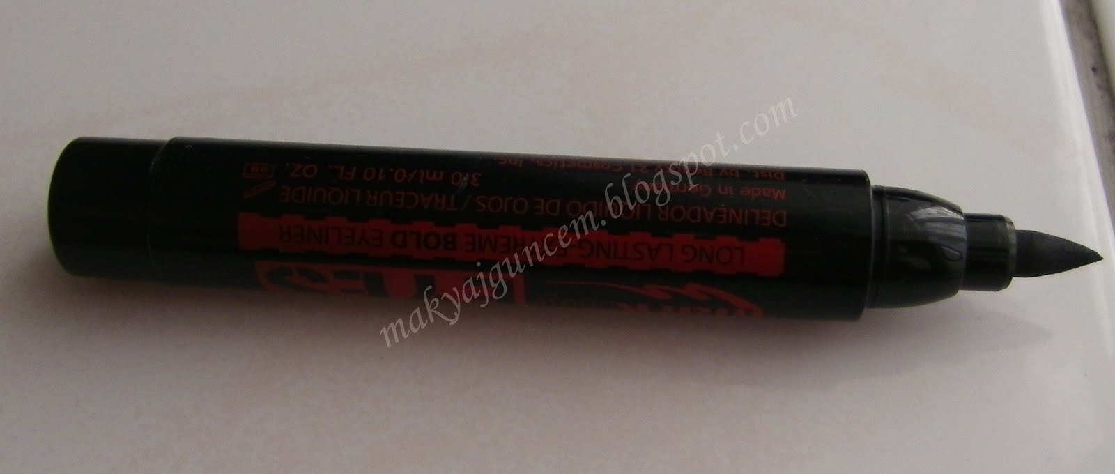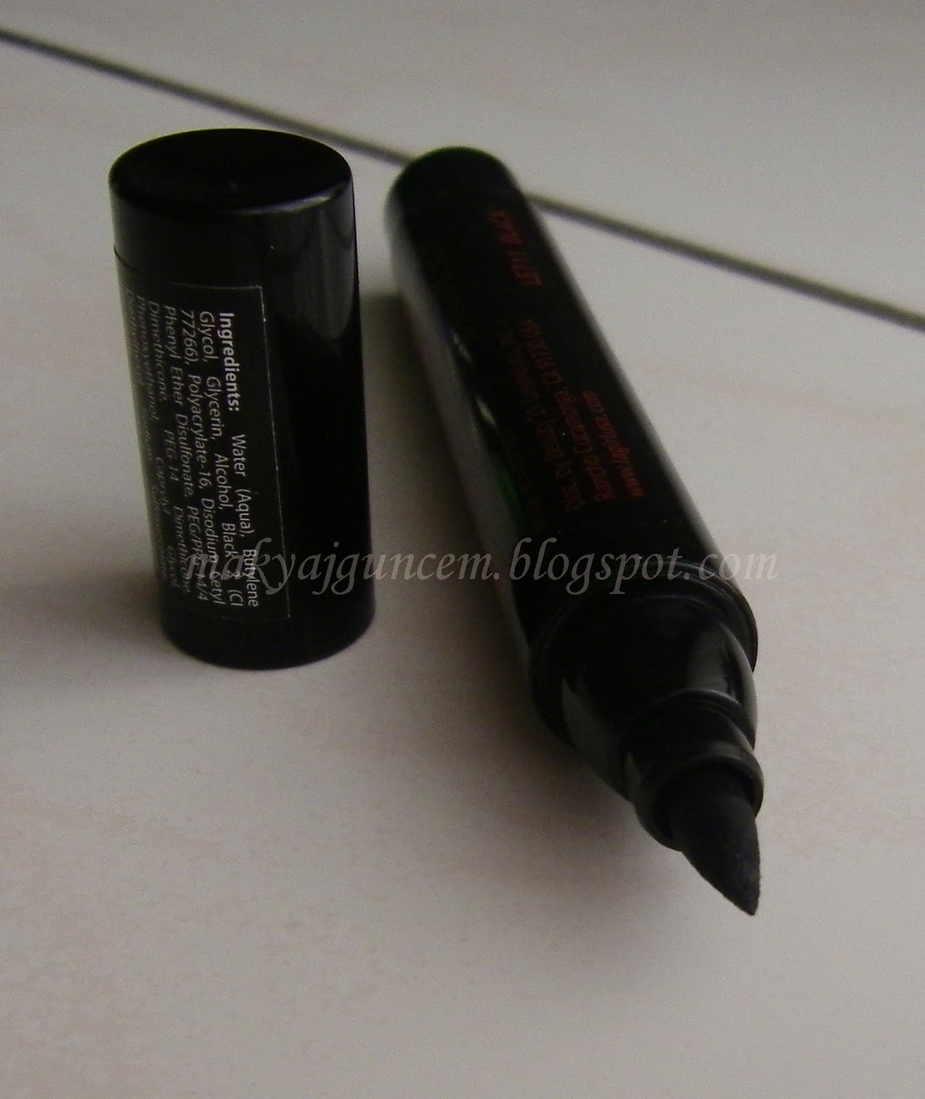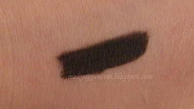 Kalem eyelinerları,diğer eyelinerlara göre kullanımları gayet kolay olduğu için çok seviyorum.Gördüğünüz üzere gayet kalın uçlu tombiş bir kalem eyeliner ve bu yüzden kullanımı gayet basit.Bu eyelinerla hiç eyeliner çekmeye beceremeyen birçok insan bile güzel eyeliner çekebilirler gözlerine.Ucu kalın olduğu için isteğe göre kalın veya ince eyeliner çekilebiliyor gözlere,tercih size kalmış;)Yumuşak uçlu olmasından mütevelit göz kapağına gayet yumuşak bir şekilde uygulanabiliyor.